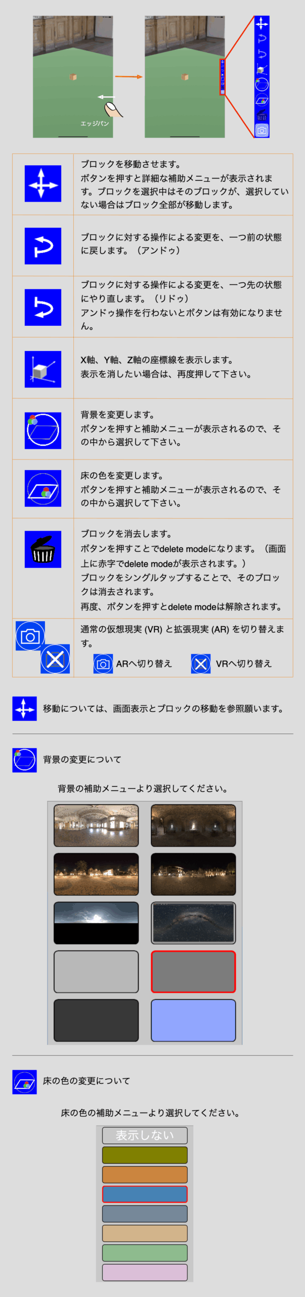 積木マスターの使い方(iPad, iPhone) 2 muusophia 2025年10月4日 画面左メニュー説明画面右メニュー説明タップ操作による動作ブロック変更メニューブロック追加ブロック削除情報表示とブロック移動AR切り替え Post Views: 3