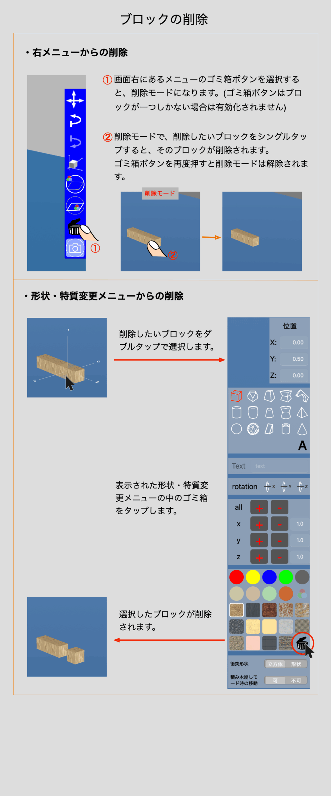 積木マスターの使い方(iPad, iPhone) 6 muusophia 2025年10月4日 画面左メニュー説明画面右メニュー説明タップ操作による動作ブロック変更メニューブロック追加ブロック削除情報表示とブロック移動AR切り替え Post Views: 3