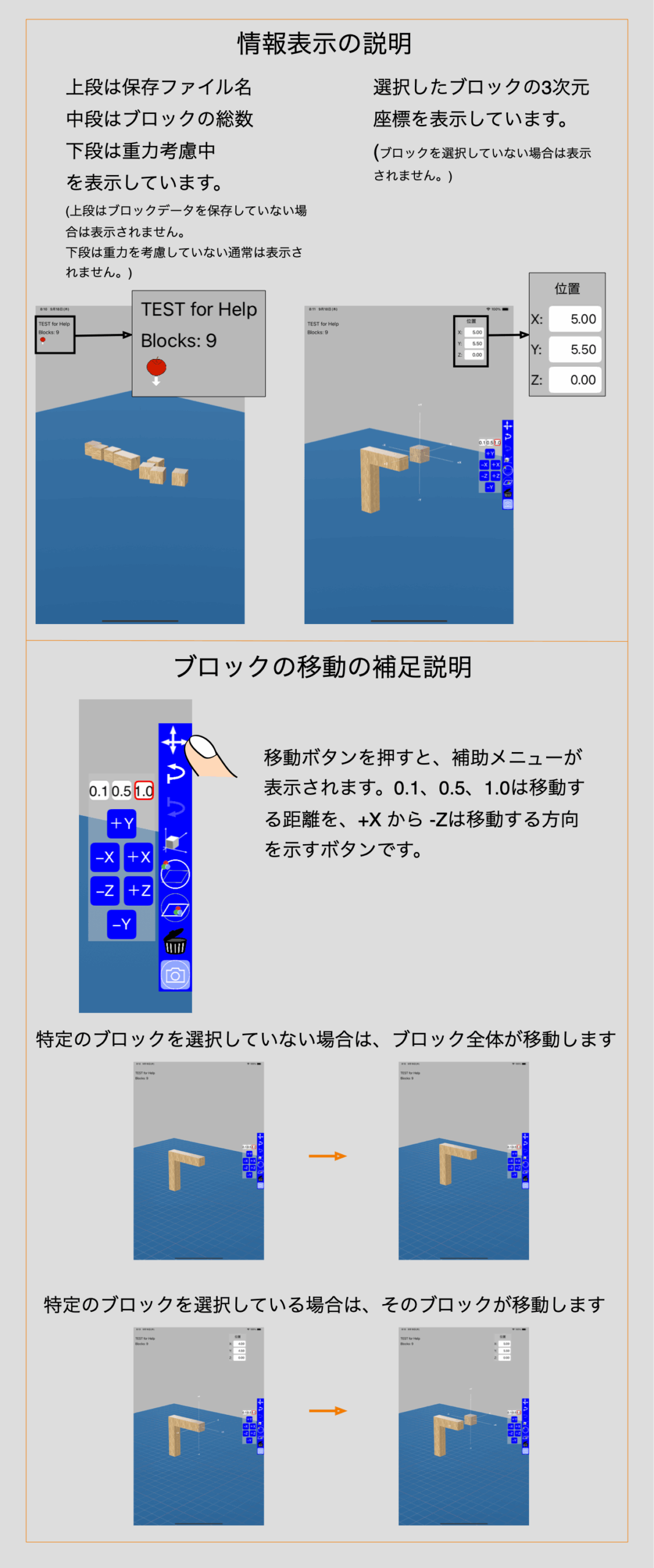 積木マスターの使い方(iPad, iPhone) 7 muusophia 2025年10月4日 画面左メニュー説明画面右メニュー説明タップ操作による動作ブロック変更メニューブロック追加ブロック削除情報表示とブロック移動AR切り替え Post Views: 4