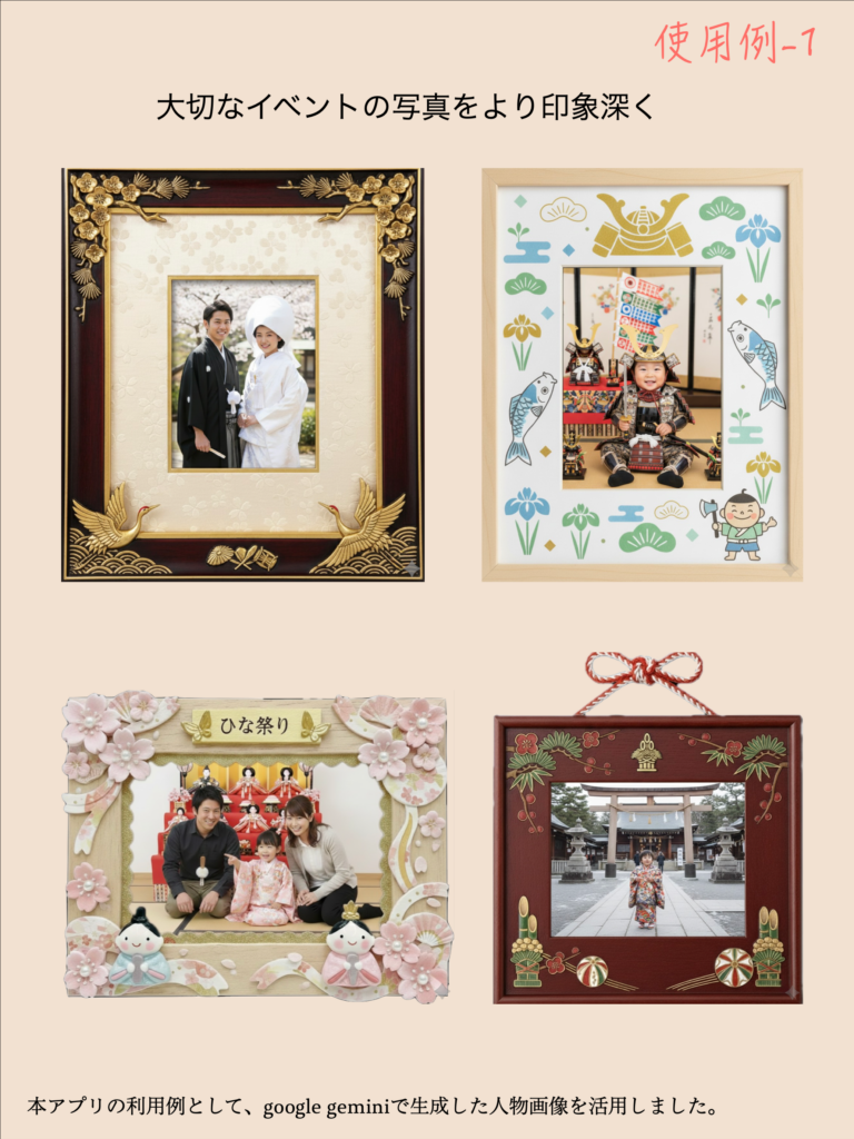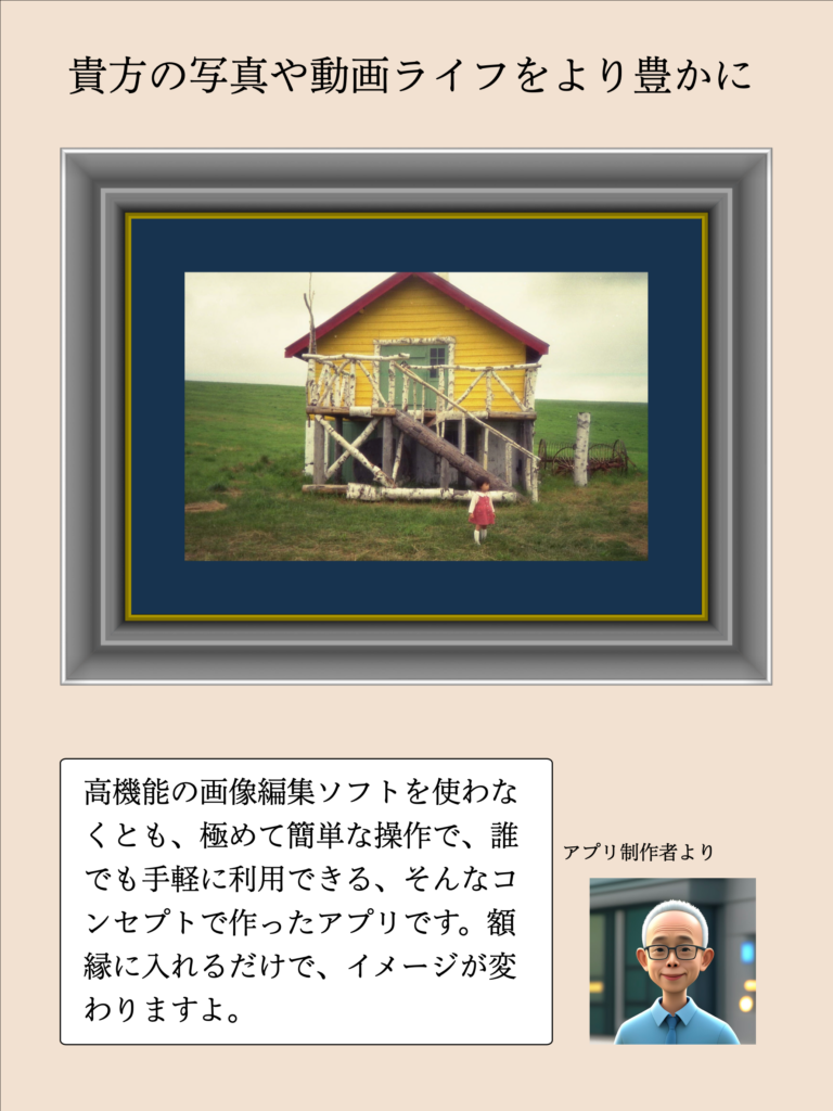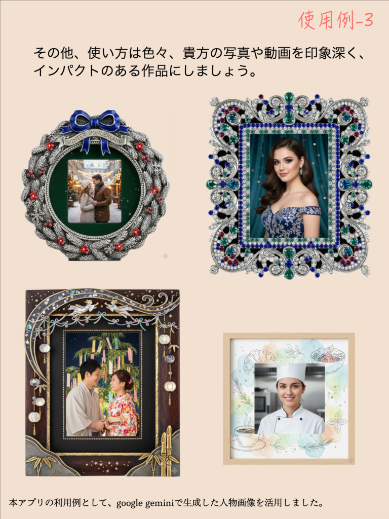 あなたの素敵な写真や動画を額縁に入れた形に加工します。