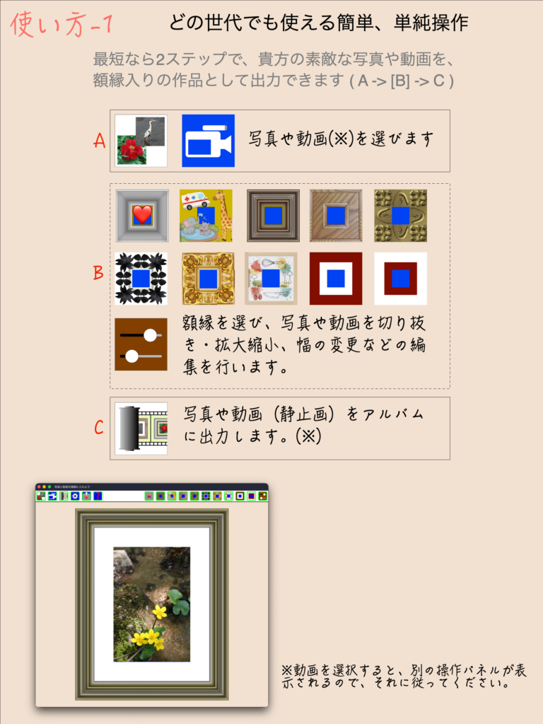 一つは、写真のファイルや動画の1フレームに額縁を付加してイメージファイルとして出力するものです。