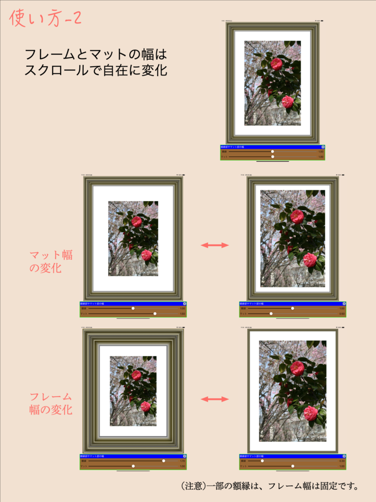 額縁のデザインは多種多様、マット幅は自由に変更可能であり、額縁の種類によってはフレーム幅も自由に変更可能です。