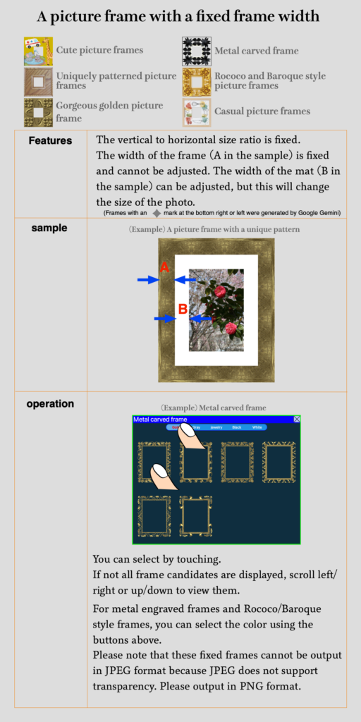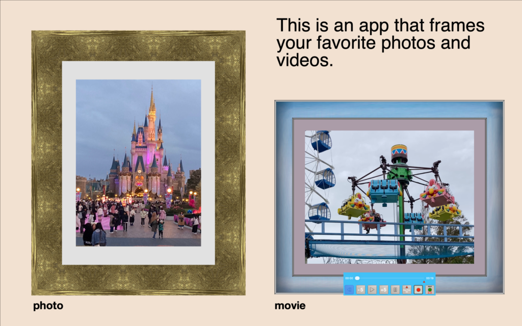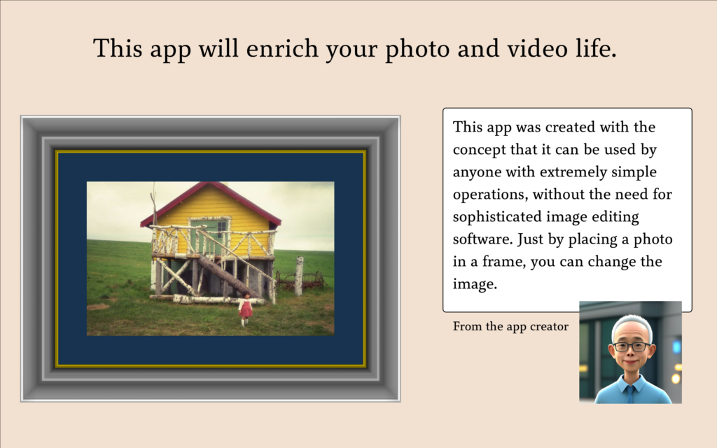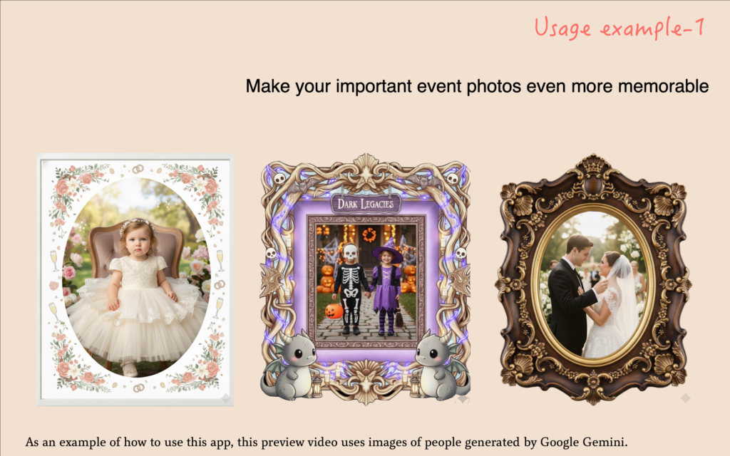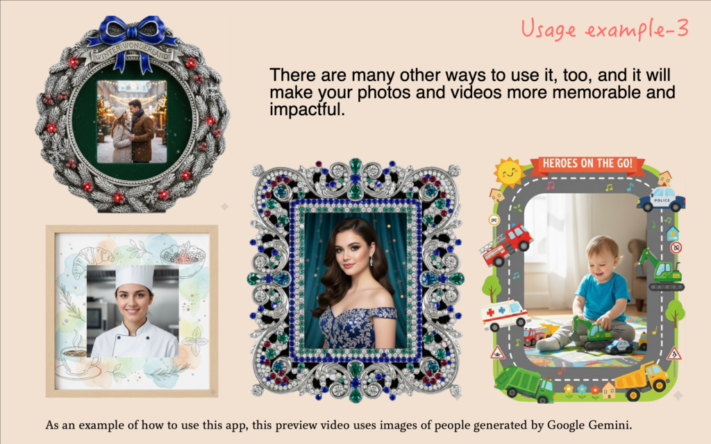 This app is designed for such users, specializing in framed photos and videos, and operates entirely on-device with no external data exchange. Some template images use AI-generated images, but since they are stored within the app, no external exchange occurs and they display quickly.